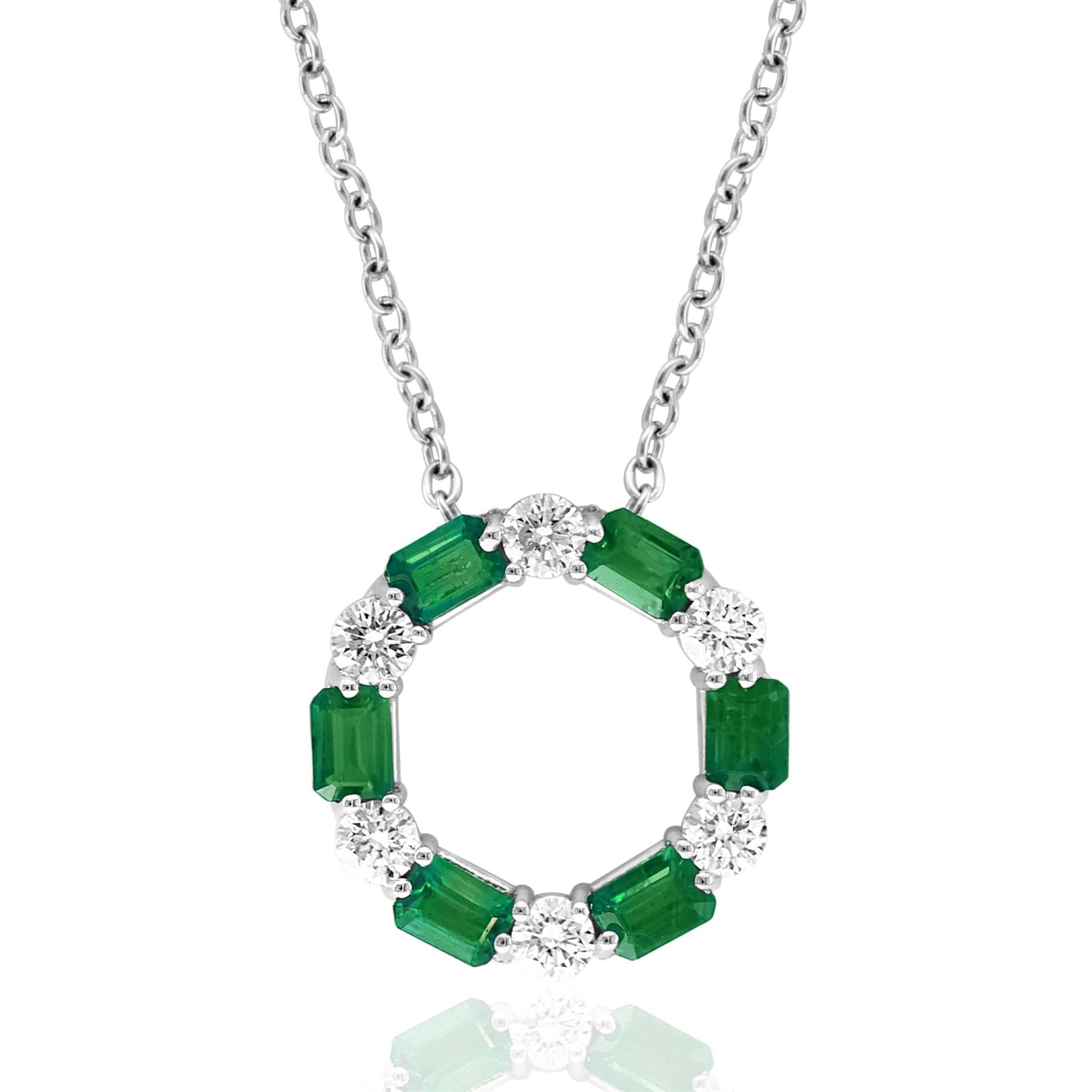 18Kt White Gold 17mm Circle Pendant with 6 Alternating Emeralds Totaling .91cttw and .67cttw Natural Diamonds (H/I Color - SI2 Clarity) on 18" Cable Chain with Lobster Clasp