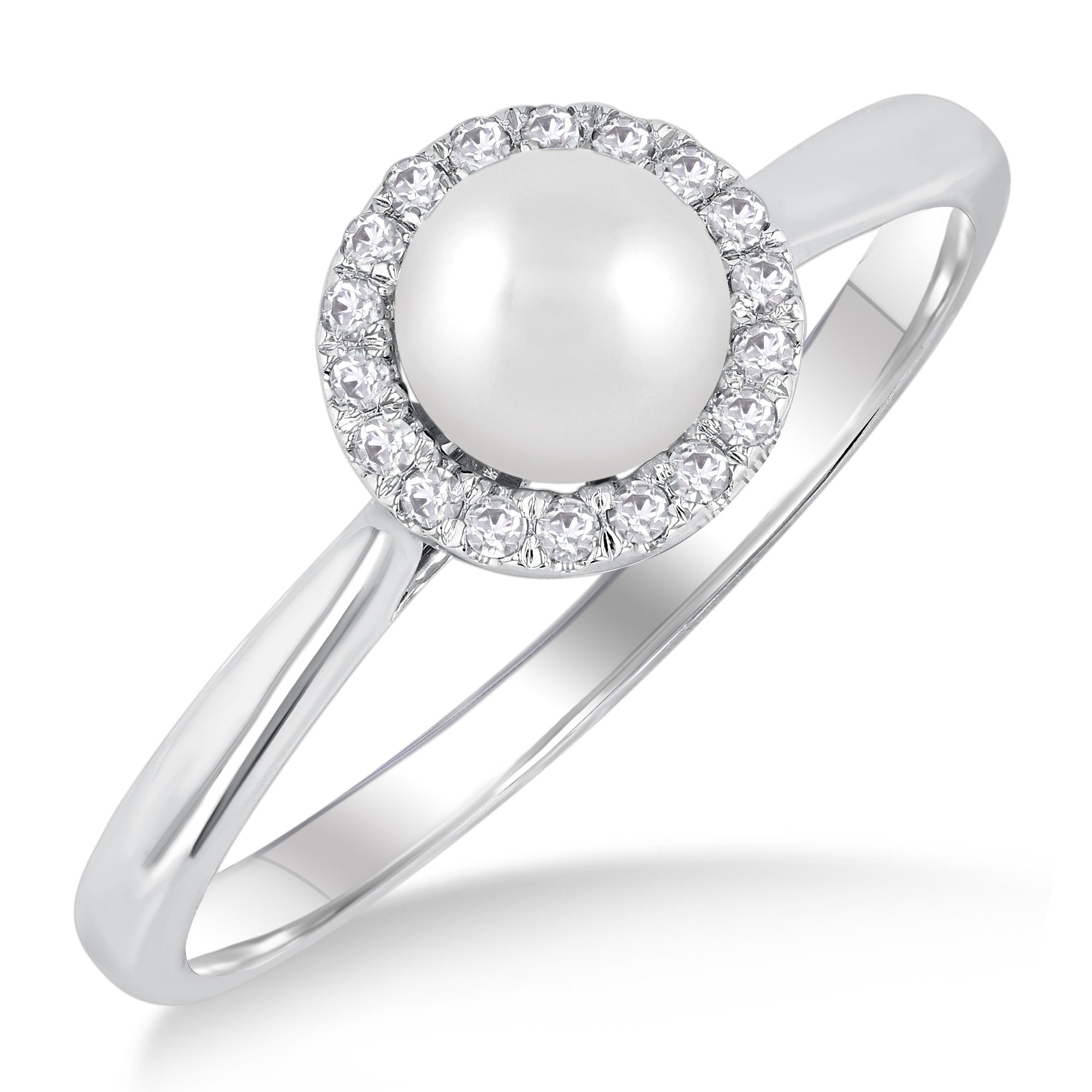 10Kt White Gold 5mm White Cultured Pearl & 0.07cttw Diamond Halo Ring - Size 6.5