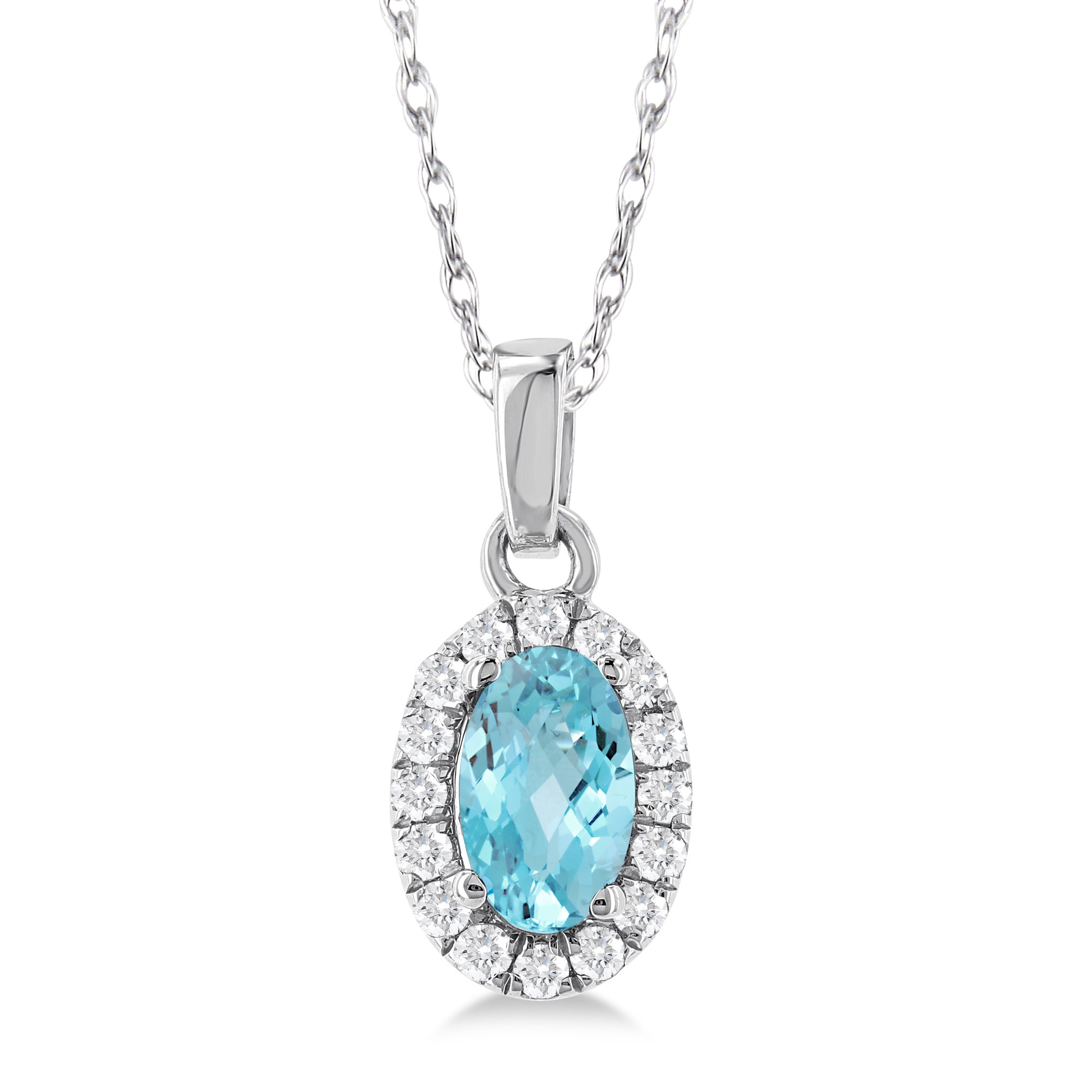 10Kt White Gold Halo Birthstone Pendant with 5x3mm Oval Aquamarine and .07cttw Natural Diamonds (Color H-I, Clarity SI2) on an 18" Chain