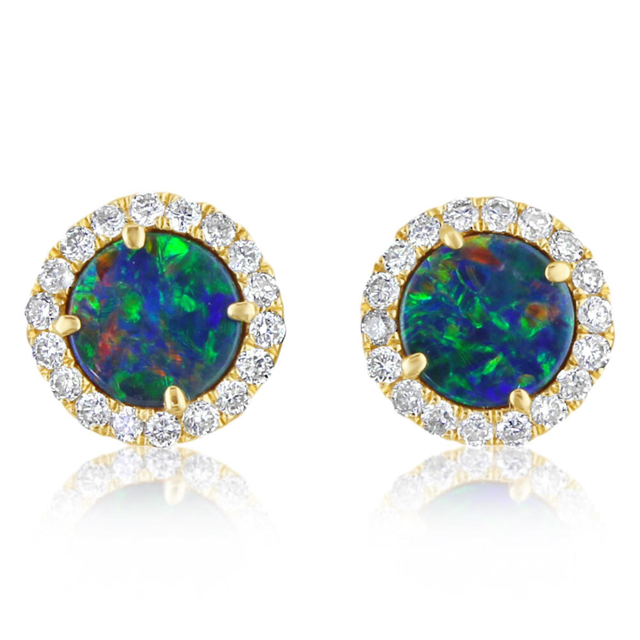 14Kt Yellow Gold 8mm .82cttw Australian Opal Doublet Halo Earrings with 36=.19cttw Diamonds Color: H-I Clarity: SI2 and Friction Backs