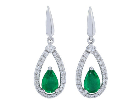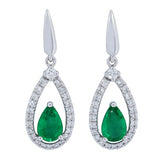 14Kt White Gold Teardrop Dangle Earrings with 2 Pear-Shaped Natural Emeralds Totaling .76cttw & .25cttw Accent Natural Diamonds (H-SI1)
