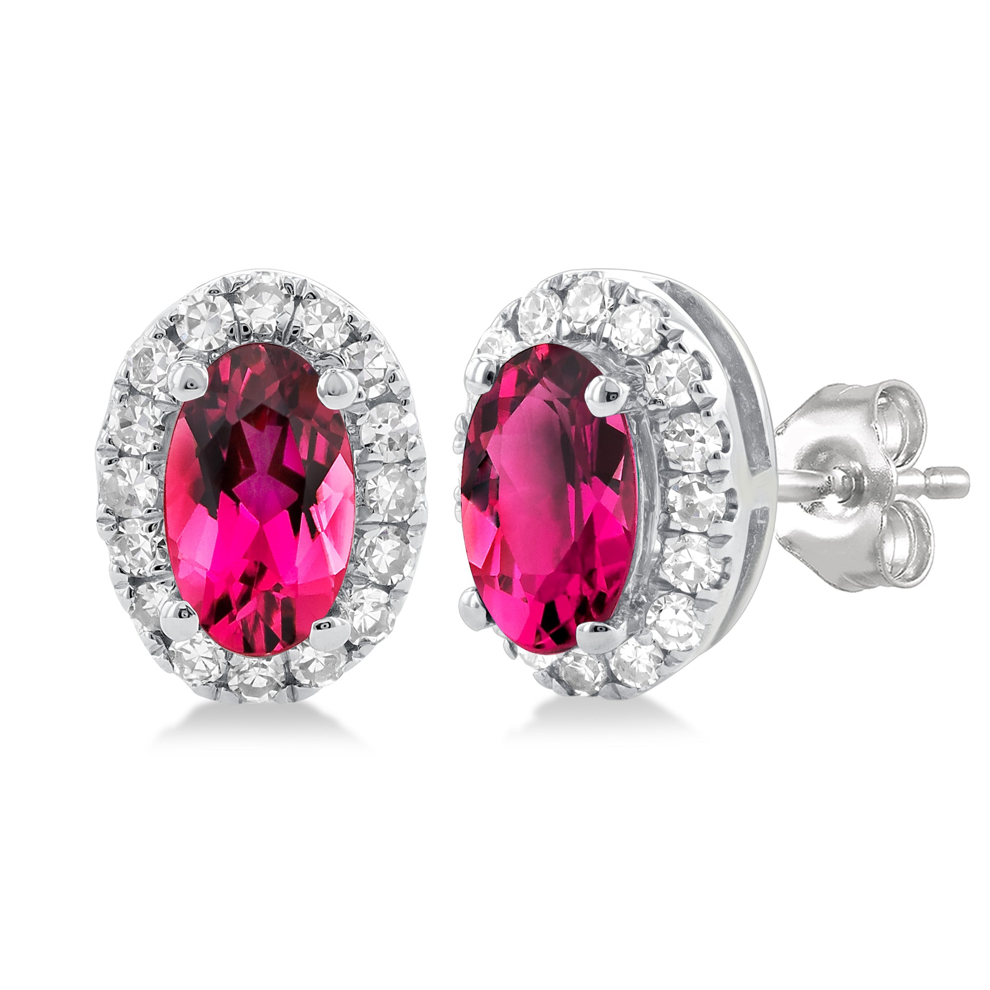 A bright and attractive Semi-Precious gemstone fashion halo stud earring, this makes an elegant addition to the jewelry case. It features an oval shape mount structure, with a 5x3 MM oval shape pink tourmaline center stone each, total 2 on both studs. Apart from this, 16 micro wall set single cut diamonds each, total 32, halo the center stone. A push-back ear nut closure secures the Semi-Precious gemstone stud earrings, which are fashioned in a polished rhodium finish 10 karat white gold. Total diamond weight is 0.13cttw.