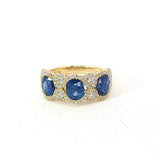 18Kt Yellow Gold 3-Stone Halo Ring with 3 Natural Sapphires Totaling 2.71 Carats and 122 Natural Diamonds .55Cttw
