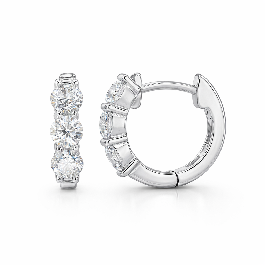 14Kt White Gold 3-Stone 3.02cttw Lab-Grown Round Diamond Huggie Hoop Earrings (F/G Color - VS1 Clarity)