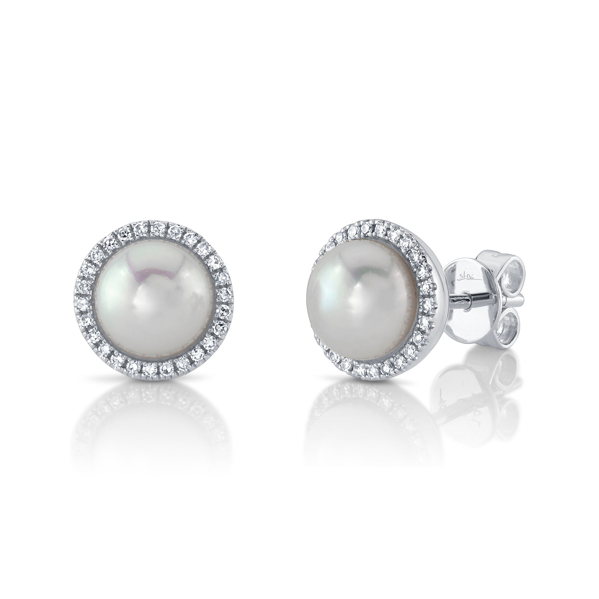 Shy Creation 14Kt White Gold Cultured Pearl Diamond Halo Stud Earrings
