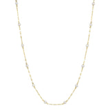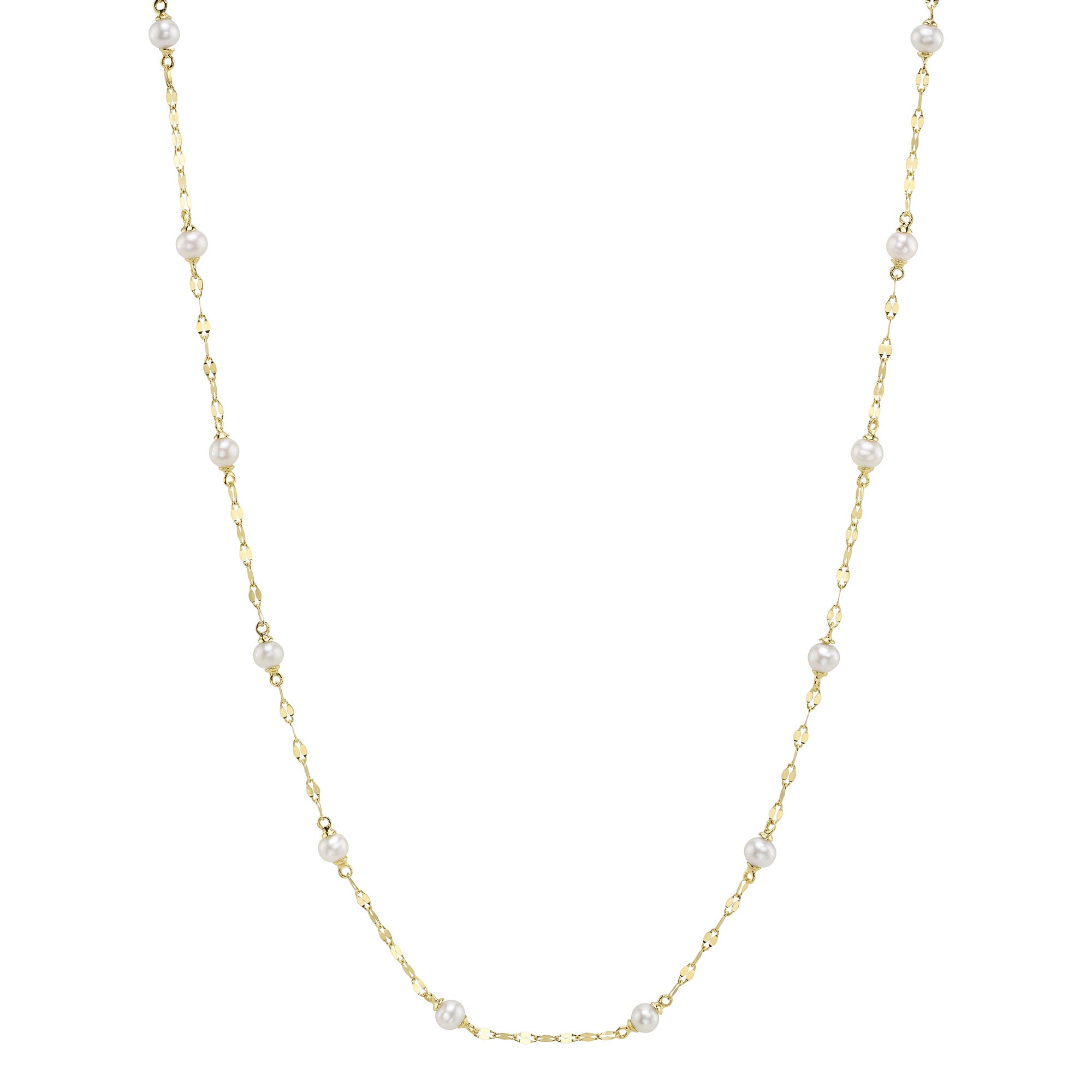 Softly radiant and effortlessly refined, this necklace features lustrous cultured white pearls delicately spaced along a polished 14k yellow gold chain. Its airy station design adds graceful movement and a timeless glow, perfect for layering or wearing as a subtle statement. Secured with a sleek lobster clasp, it can be worn at 15, 16, 17, or 18 inches for a perfectly adjustable fit. Elegant and versatile, it brings a whisper of luxury to any look.