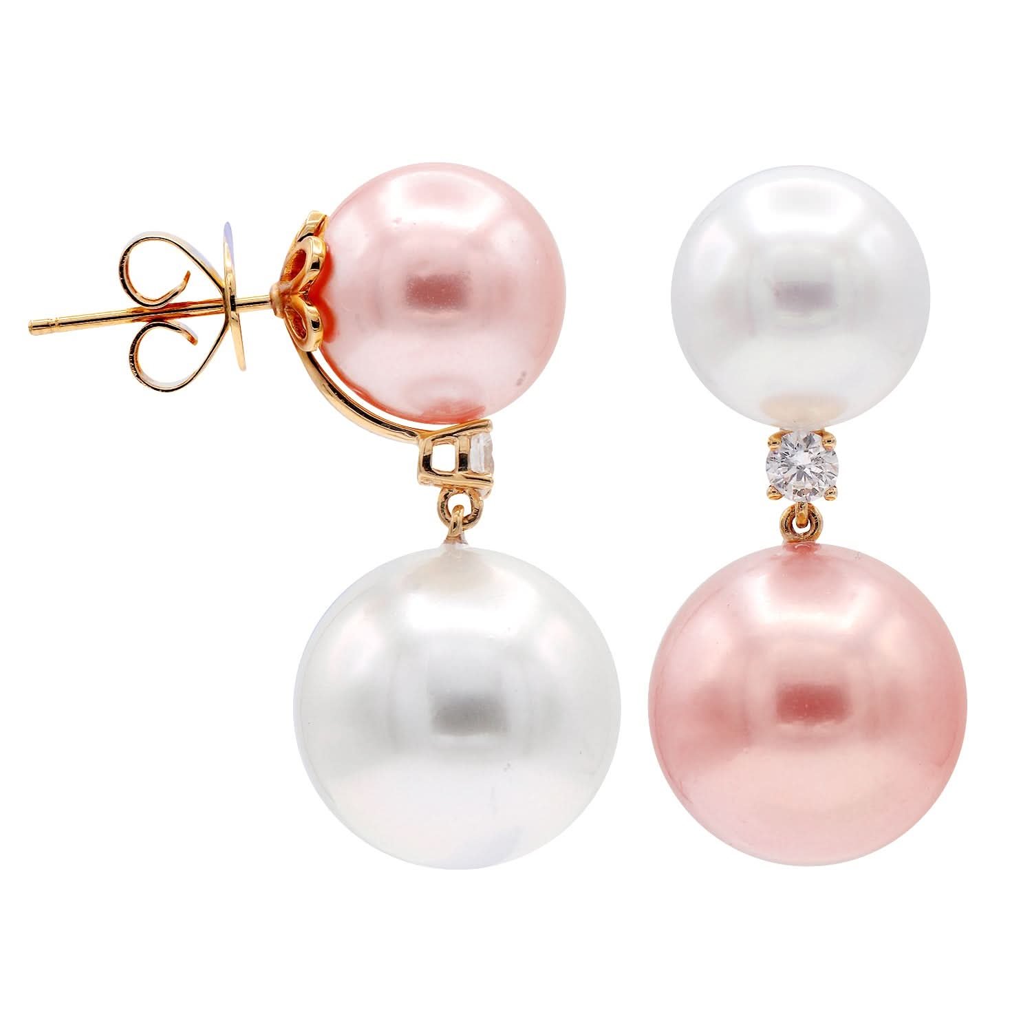 18Kt Rose Gold Earrings with 11-14mm Pink Fresh Water Pearls and South Sea Pearls .25cttw Diamonds