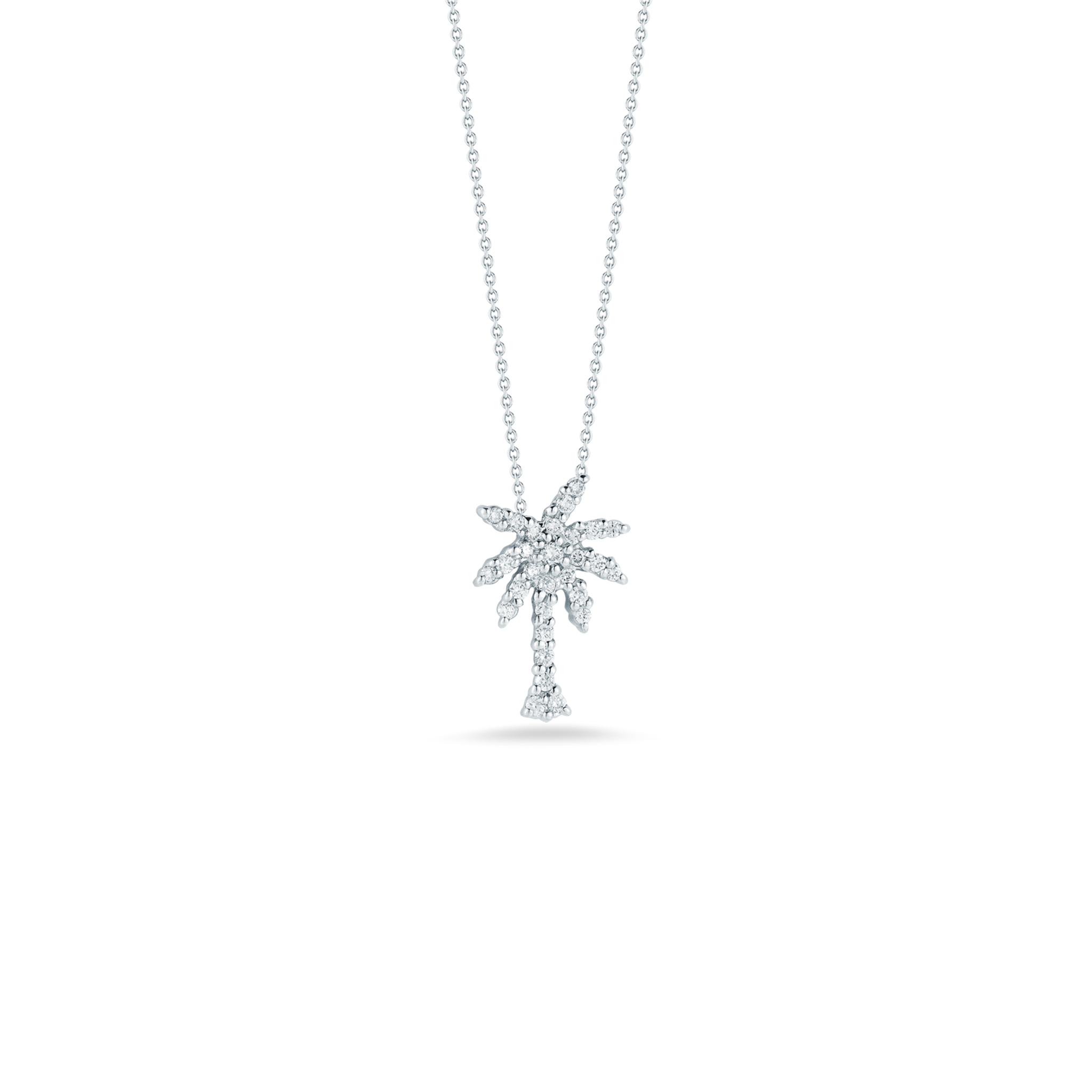 Roberto Coin 18Kt White Gold Tiny Treasures Small Palm Tree Necklace with .18 Carats (G Color - SI1 Clarity) Round Natural Diamonds on a 18" Cable Chain. Pendant mesaures approximately 13x10mm.