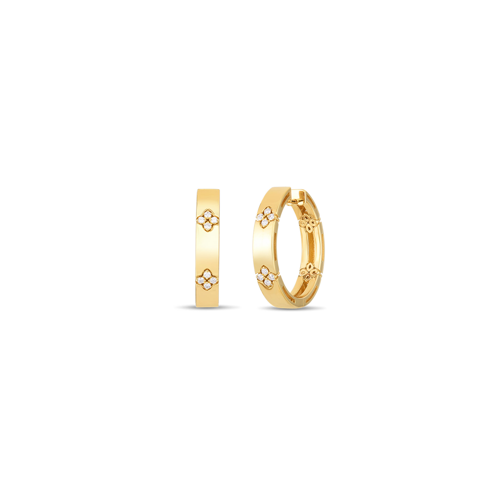 Roberto Coin 18Kt Yellow Gold Love In Verona Large .12 Carats (G Color - SI1 Clarity) Round Natural Diamond Flower Hoop Earrings. Hoops measure 20mm.