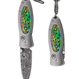 The Morpheus 'Flash' belongs equally on your neck as a pendant in your pocket as a keychain knife or on display as a beautiful piece of functional art. The blade is crafted using hand-forged 'Intrepid' damascus steel by Chad Nichols and the handle is crafted from aerospace-grade titanium inlaid with Black Sea Dichrolam. This fine knife also features a spinel gemstone and black PVD coated bronze chain. A fine functional and timeless William Henry creation. Materials: Dichrolam Hand-forged damascus Spinel Titanium Features Specs: Safe button lock system Dimensions: Blade 1.60" (40.64mm) Handle 2.25" (56.0mm) Overall open 3.80" (96.52mm)