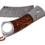 The Havana pays homage to the birthplace of fine cigars and is without equal in the world of exotic cigar cutters. The thru hole in the titanium frame will accommodate up to a 52 gauge cigar and the single sided precision ground damascus blade cuts cleanly thru your preferred smoke. The damascus is our stainless 'Boomerang' pattern by Chad Nichols featuring three alloys forged together into a tapestry in steel with an optimum hardness of HRC 59 for wear resistance. Inlayed Arizona Ironwood is hand-polished to fine luster and citrine gemstones titanium stainless and sterling hardware complete the presentation. Materials: Citrine Desert Ironwood Hand-forged damascus Titanium Dimensions: Blade: 2.75" Handle: 3.75" Open: 6.5