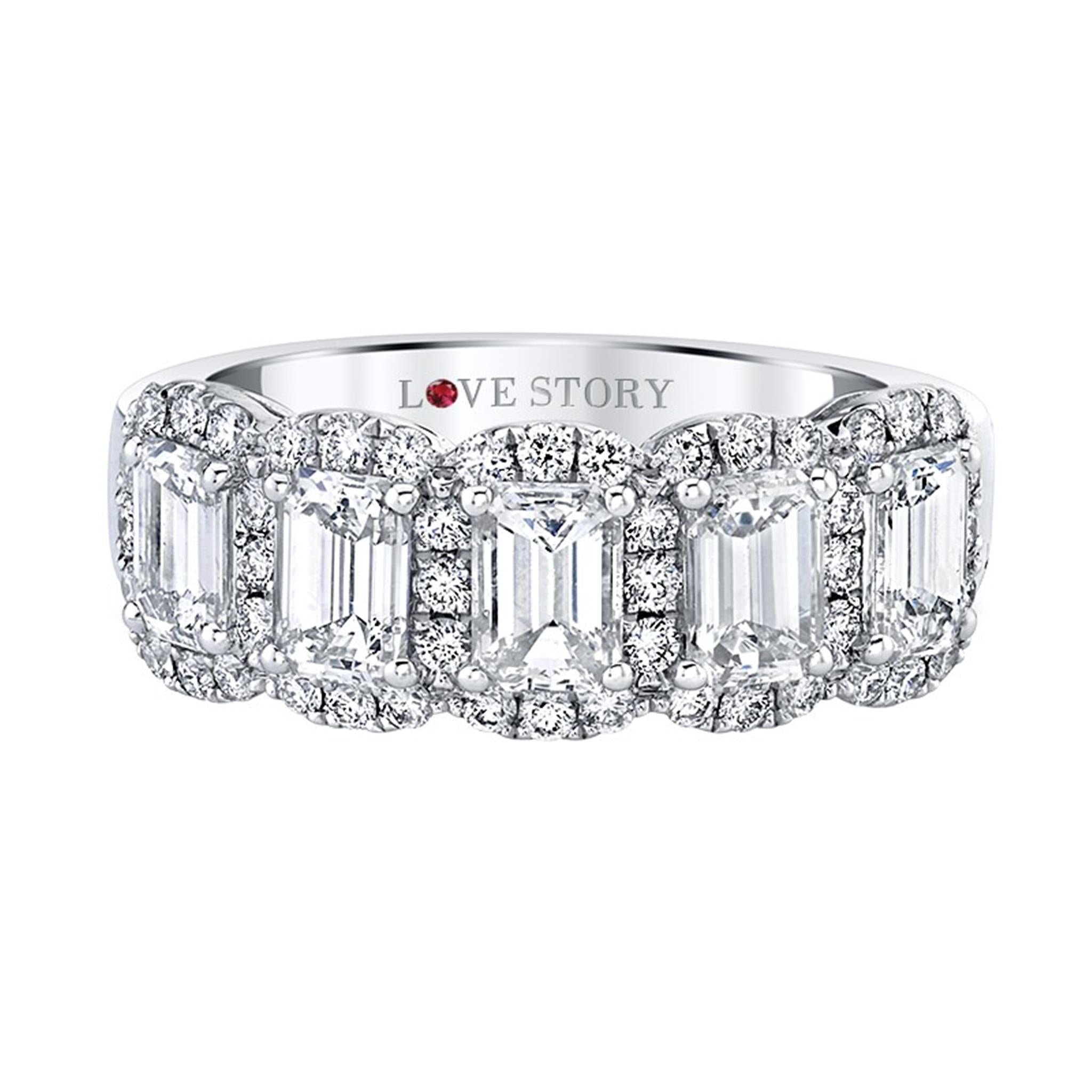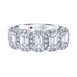 14kt White Gold Center Of My World Halo Ring with five emerald cut diamonds totaling 1.26cttw (H Color - VS2 Clarity) Surrounded by 0.33cttw Round Accent Diamonds (H Color - SI1 Clarity)