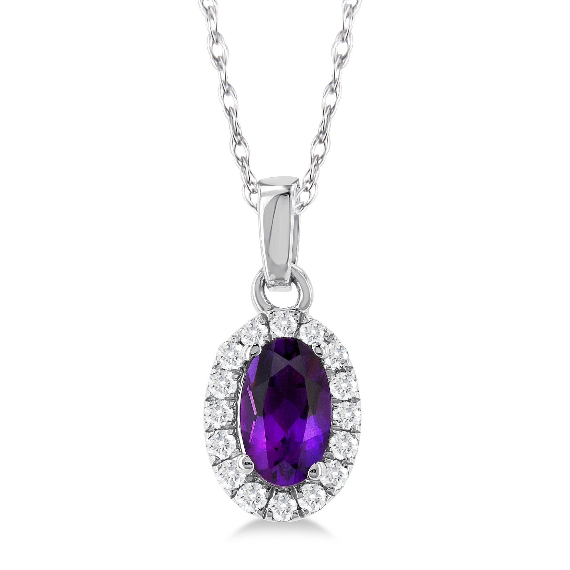10Kt White Gold Halo Birthstone Pendant with 5x3mm Oval Amethyst and .07cttw Natural Diamonds (Color H-I, Clarity SI2) on an 18" Chain