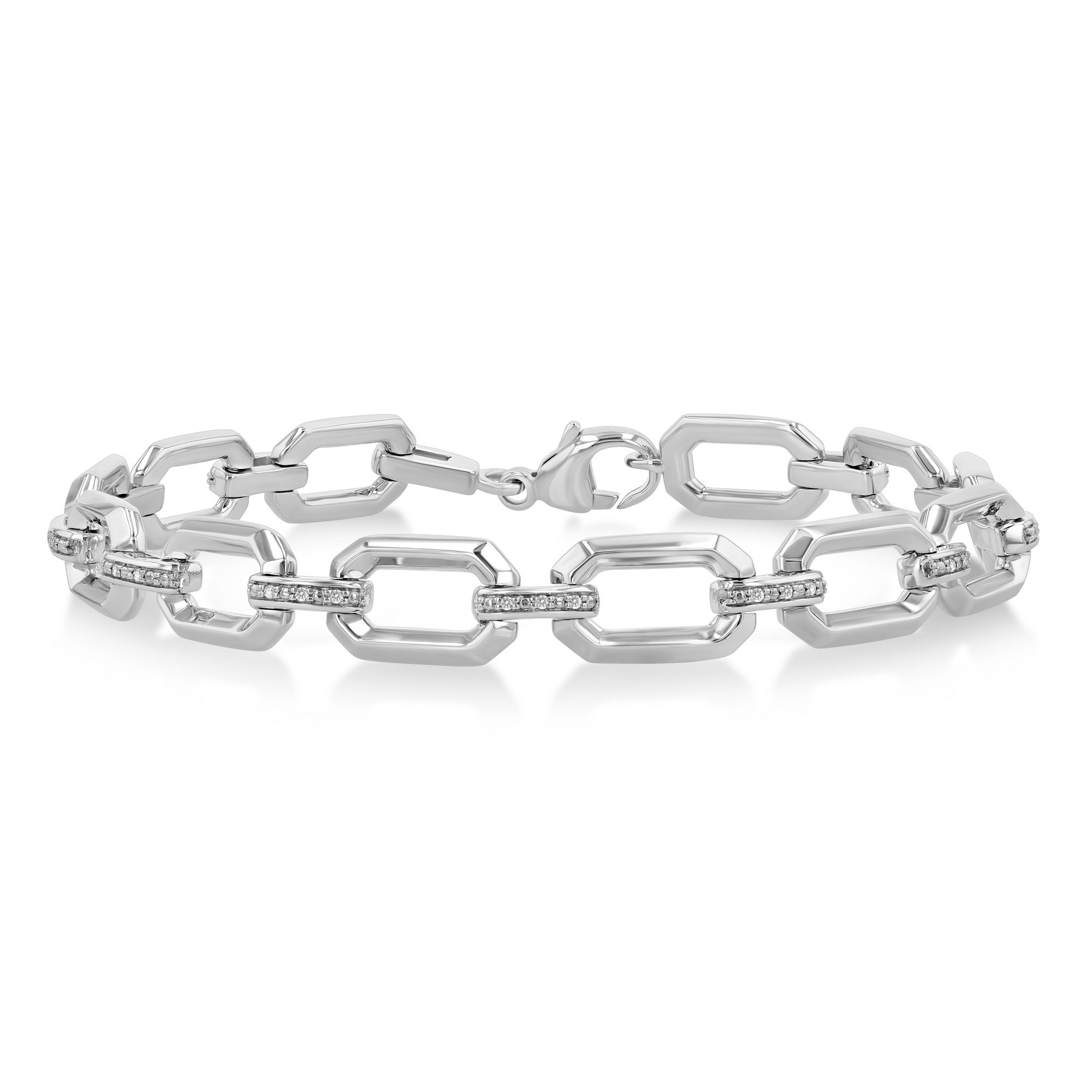 A chic diamond fashion bracelet, this adds a subtle yet stunning accent to your wrist. It features elegant open window plain silver emerald-shaped links, each connected by sparkling D-links adorned with 3 each pave set round cut diamonds, total 30, embellishing the 10 D-links. The bracelet is crafted in rhodium-finished sterling silver, offering a sleek and polished look that complements any ensemble. A secure lobster clasp closure ensures the bracelet stays in place, providing both beauty and functionality. The total diamond weight is 0.10cttw.