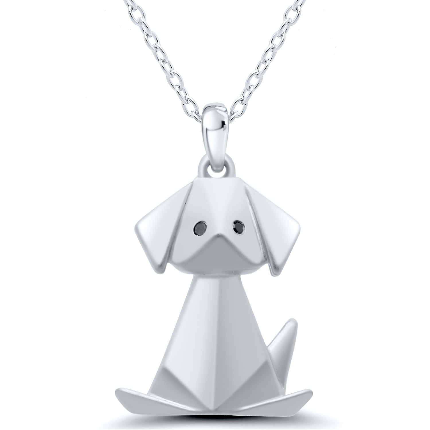 Sterling Silver Satin Finish Origami Dog Pendant with Black Diamond Eyes on 16-18" Cable Chain